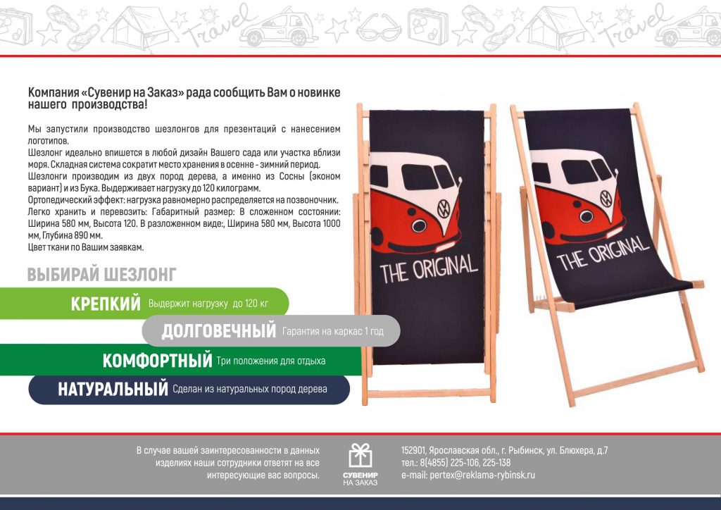 Шезлонги являются репликой немецкого шезлонга для Фольцвагена. Шезлонг складной. Шезлонг для пляжного отдыха и для перевозки в автомобиле. Ткань полиоксфорд с нанесенным на всю площадь полноцветным изображением, стойким к солнечному УФ-излучению. Нанесение на шезлонг — сублимация. Возможно нанесение логотипа гравировкой на деревянный каркас шезлонга. Дополнительно может быть отшита сумка для шезлонга, так же с вашим логотипом.