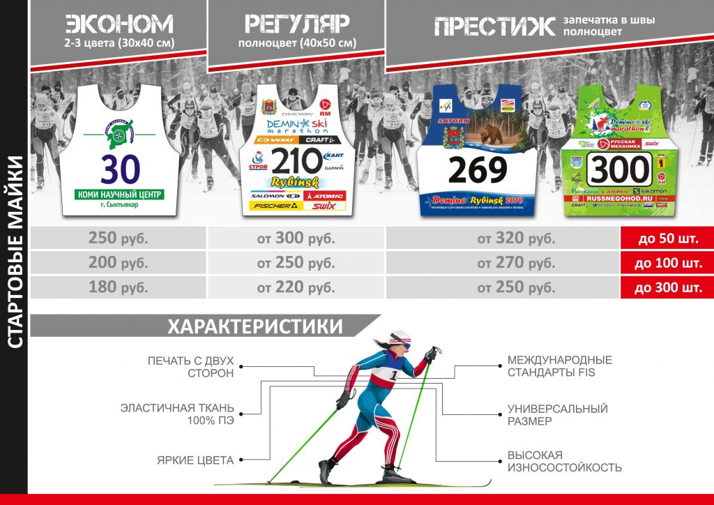Изображение устойчиво к воздействию погодных условий – будь то дождь или палящие лучи солнца. Мы можем предложить Вам изготовление стартовых номеров из различных тканей: «прима», ложная сетка — это трикотаж (он тянется за счет вязаной петлевой структры) и « эластик» или «бифлекс» (ткань с добавлением лайкры, тянется намного больше чем трикотажные ткани). Майки, сшитые из такой ткани, не сковывают движения спортсмена. Например, майка сшитая из трикотажа (в нерастянутом состоянии шириной 42 см) тянется до 52 см, а майка из элластичной ткани — до 62 см).